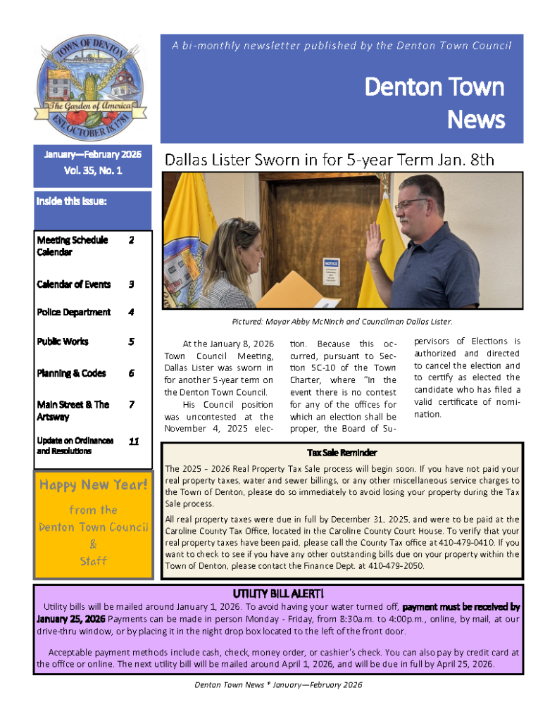 Subscribe to the Town Newsletter Newsletter Sign-up First Name * Last Name * Email * If you are human, leave this field blank. Submit Click here for the Current Issue of the Denton Town News. Past Newsletters 2026PDF January – February 20262025PDF January – February 2025PDF March – April 2025PDF May-June 2025PDF July – August 2025PDF September – October 2025PDF November-December 20252024PDF January – February 2024PDF March – April 2024PDF May – June 2024PDF July – August 2024PDF September – October 2024PDF November – December 20242023PDF January/February 2023PDF March/April 2023PDF May/June 2023PDF July/August 2023PDF September / October 2023PDF November/December 20232022PDF January/ February 2022PDF March/April 2022PDF May/June 2022PDF July/August 2022PDF September/October 2022PDF November/December 20222021PDF January/February 2021PDF March/April 2021PDF May/June 2021PDF July/August 2021PDF September/October 2021PDF November/December 20212020PDF January/February 2020PDF March/April 2020PDF May/June 2020PDF July/August 2020PDF September/October 2020PDF November/December 20202019PDF January/February 2019PDF March/April 2019PDF May/June 2019PDF July/August 2019PDF September/October 2019PDF November/December 20192018PDF January/February 2018PDF March/April 2018PDF May/June 2018PDF July/August 2018PDF September/October 2018PDF November/December 20182017PDF January/February 2017PDF March/April 2017PDF May/June 2017PDF July/August 2017PDF September/October 2017PDF November/December 20172016PDF January/February 2016PDF March/ April 2016PDF May/ June 2016PDF July/August 2016PDF September/October 2016PDF November/December 20162015PDF January/February 2015PDF March/April 2015PDF May/June 2015PDF July/August 2015PDF September/October 2015PDF November/December 20152014PDF January/February 2014PDF March/April 2014PDF May/June 2014PDF July/August 2014PDF September/October 2014PDF November/December 20142013PDF January/February 2013PDF March/April 2013PDF May/June 2013PDF July/August 2013PDF September/October 2013PDF November/December 20132012PDF January/February 2012PDF March/April 2012PDF May/June 2012PDF July/August 2012PDF September/October 2012PDF November/December 20122011PDF January/February 2011PDF March/April 2011PDF May/June 2011PDF July/August 2011PDF September/October 2011PDF November/December 20112010PDF January/February 2010PDF March/April 2010PDF May/June 2010PDF July/August 2010PDF September/October 2010PDF November/December 20102009PDF January/February 2009PDF March/April 2009PDF May/June 2009PDF July/August 2009PDF September/October 2009PDF November/December 20092008PDF March/April 2008PDF May/June 2008PDF July/August 2008PDF September/October 2008PDF November/December 20082007PDF January/April 2007PDF May/June 2007PDF July/August 2007PDF September/October 2007PDF November/December 2007